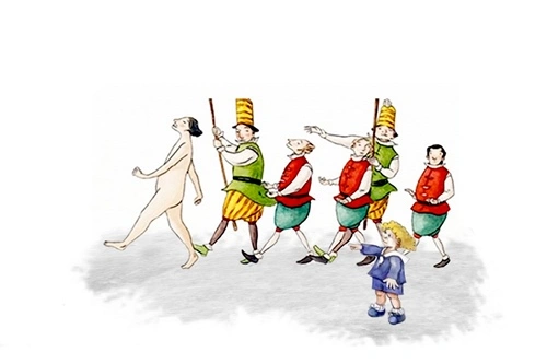 The vain emperor walks in procession without clothes. Fearing to appear